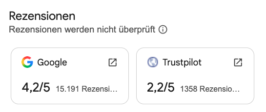 Was auf den ersten Blick auffällt: Auf Trustpilot sind es gerade mal 1.358 Rezensionen mit einer Bewertung auf der gleichen Skala von 2,2.