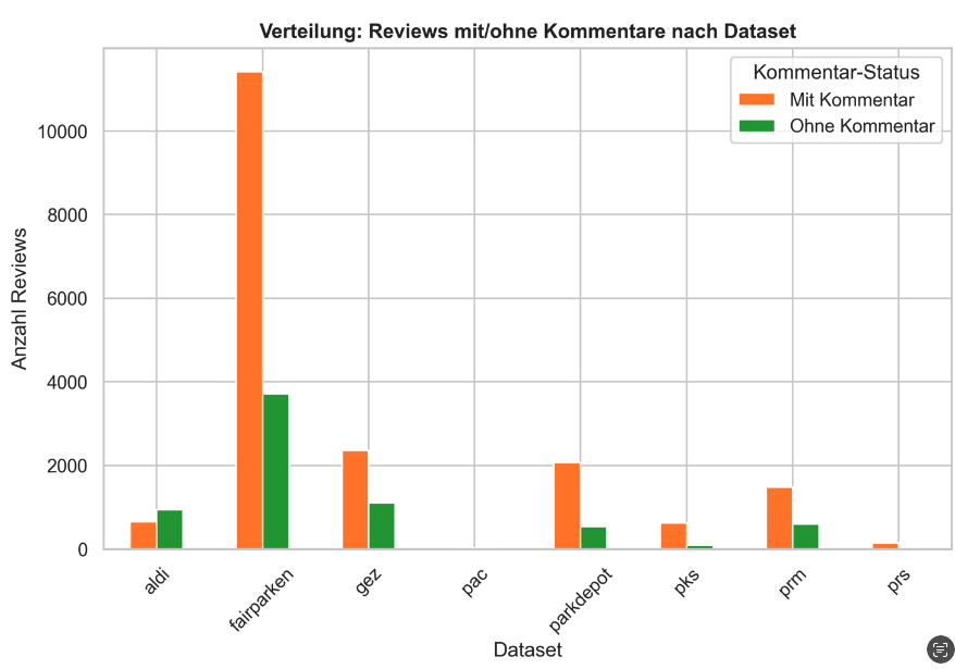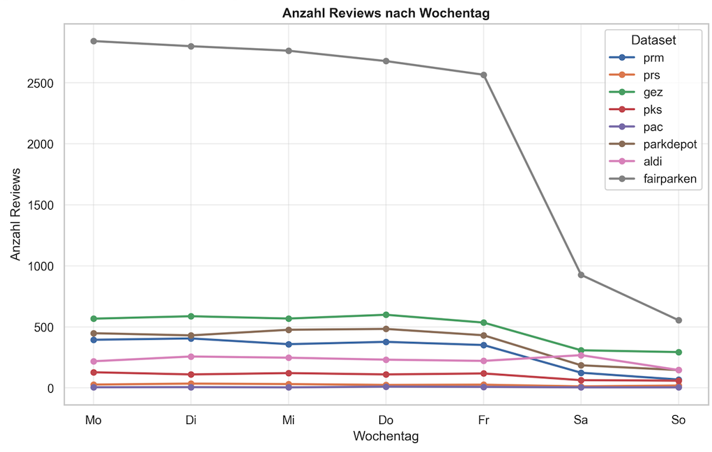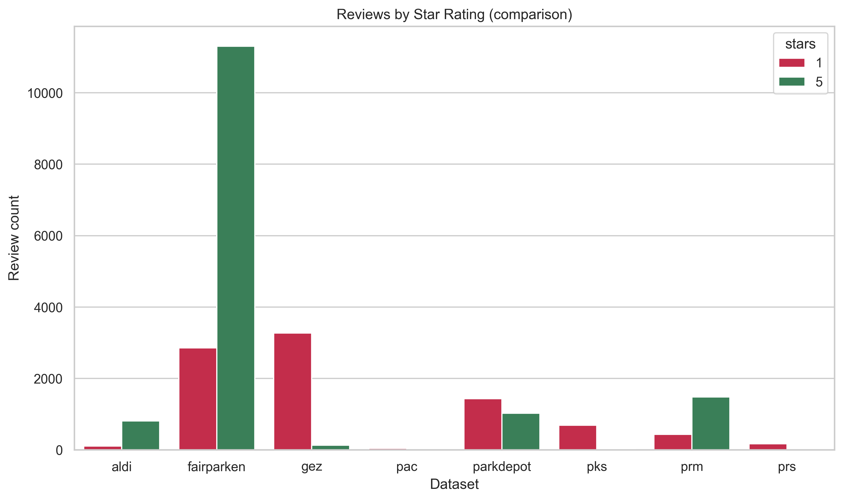Der Blick auf die groben Zahlen ist wenig befriedigend, erst Recht nicht für einen Data Analysten. Also habe ich mir mal einen Sack voll Daten besorgt, nämlich alle Rezensionen der Fair Parken GmbH sowie der Vergleichsunternehmen.