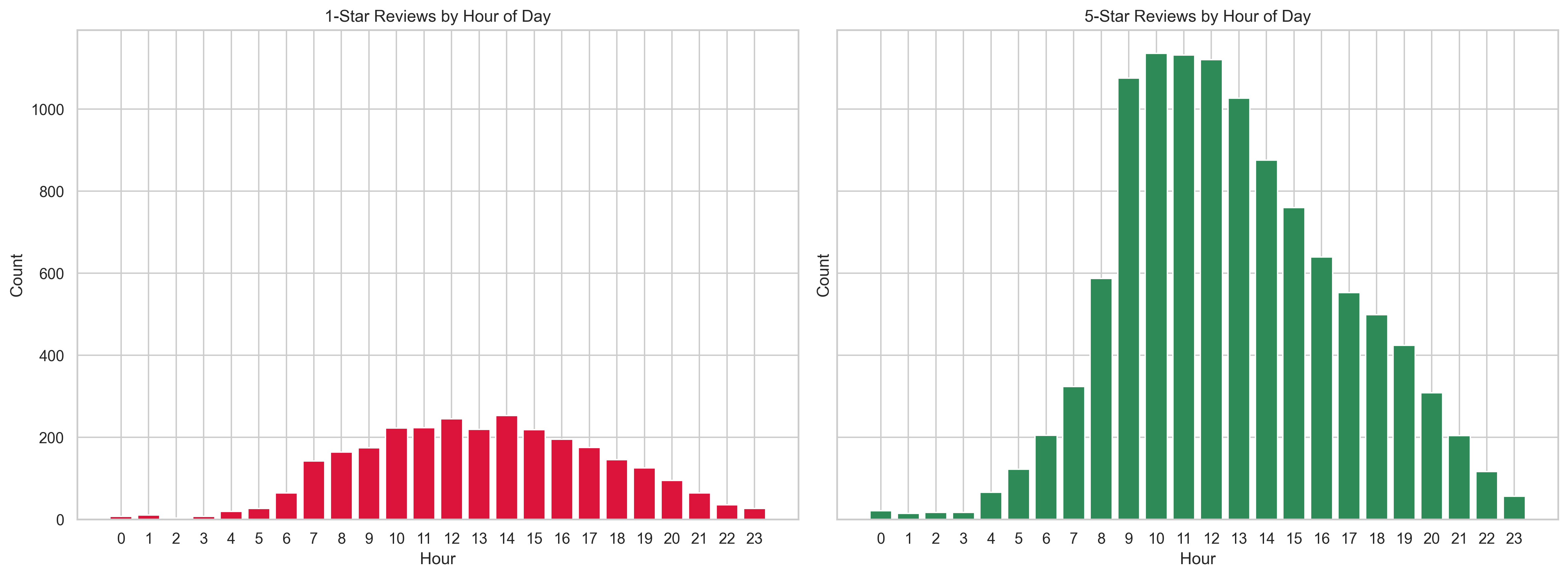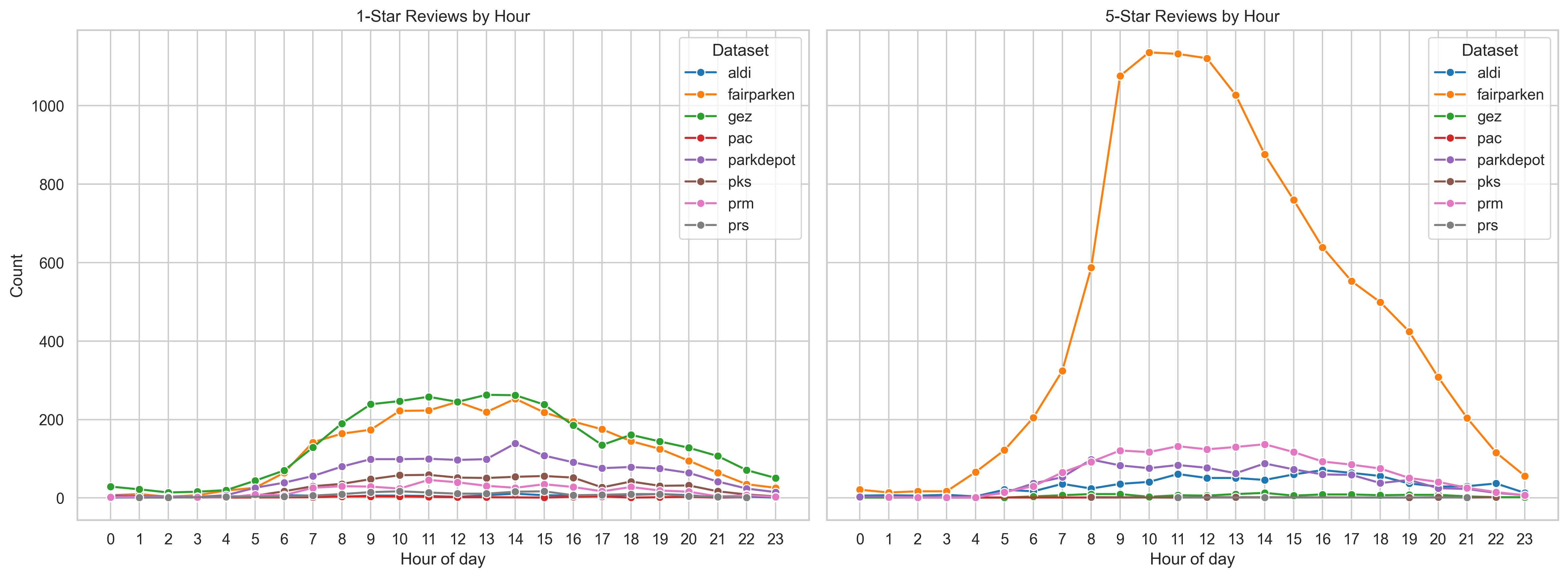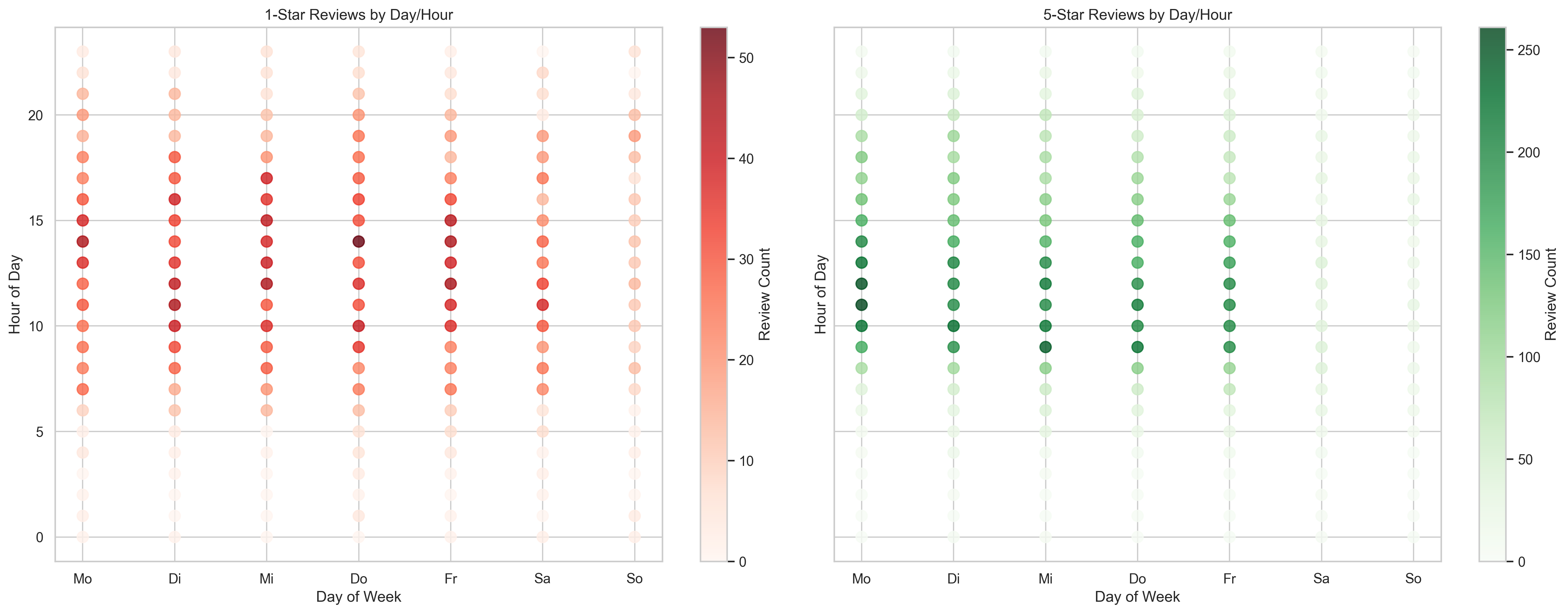 Betrachtet man nur die 1- und 5-Sterne Bewertungen, zeigt sich ein ähnliches Bild. Am Wochenende werden eher schlechte Bewertungen abgegeben, erkennt man zwar die Muster der Verteilung wieder, aber kein klares entgegengesetztes Muster bei der Tageszeit.