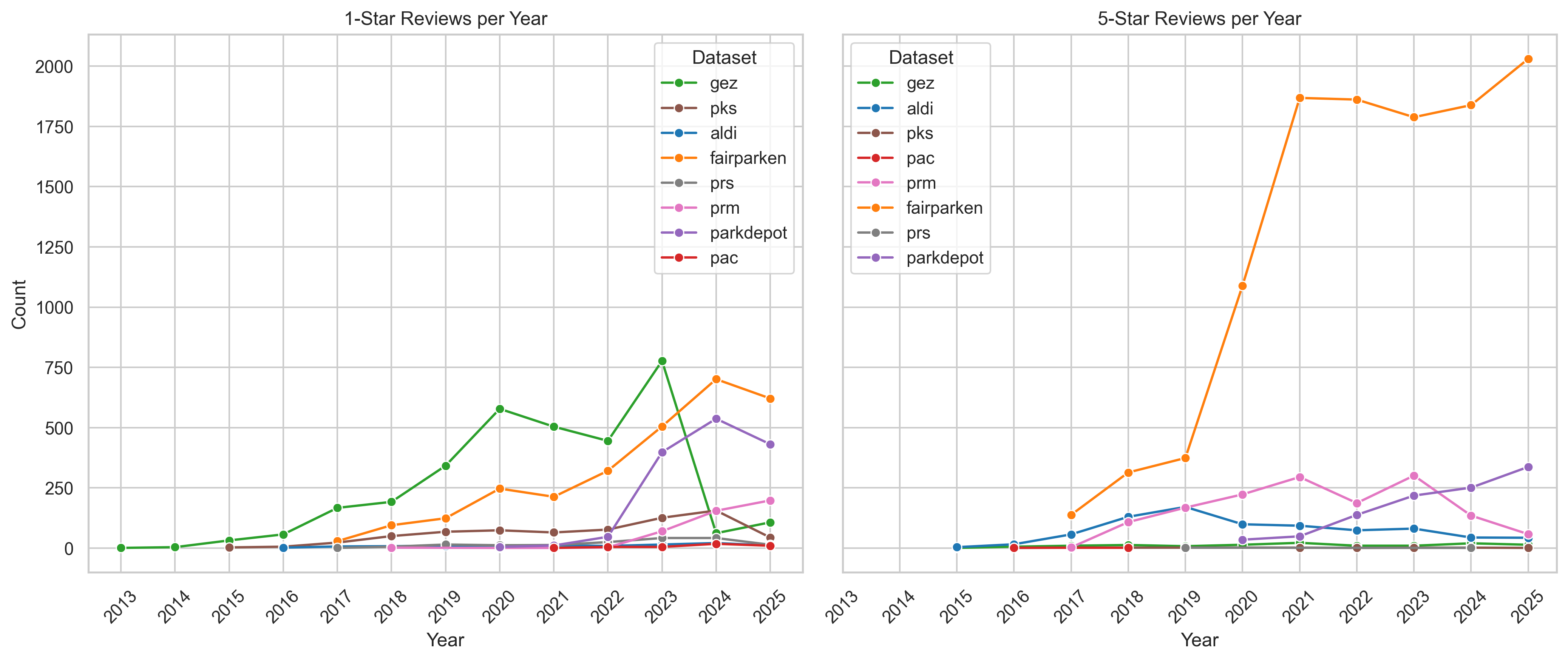 Einzig die PRM kann bei den 5-Sterne Bewertungen einen leichten Anstieg in 2020 und 2021 verbuchen, lange nicht so stark wie Fair Parken. Bei Aldi gehen die Bewerungen im gleichen Zeitraum nach unten, bei den anderen Unternehmen ist kein klarer Trend erkennbar.