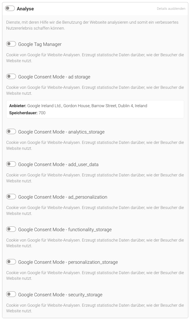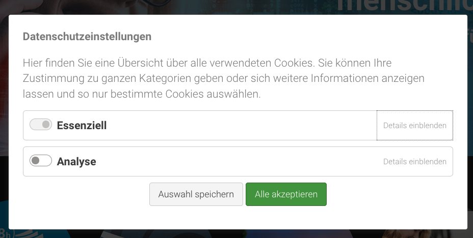 Beim Klick auf “Alles Akzeptieren” verschiebt sich der Schalter für “Analyse” mehr oder weniger unaufällig nach “rechts”.