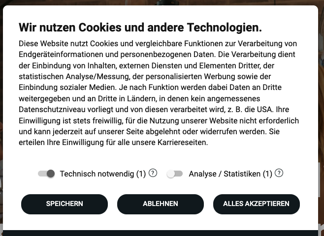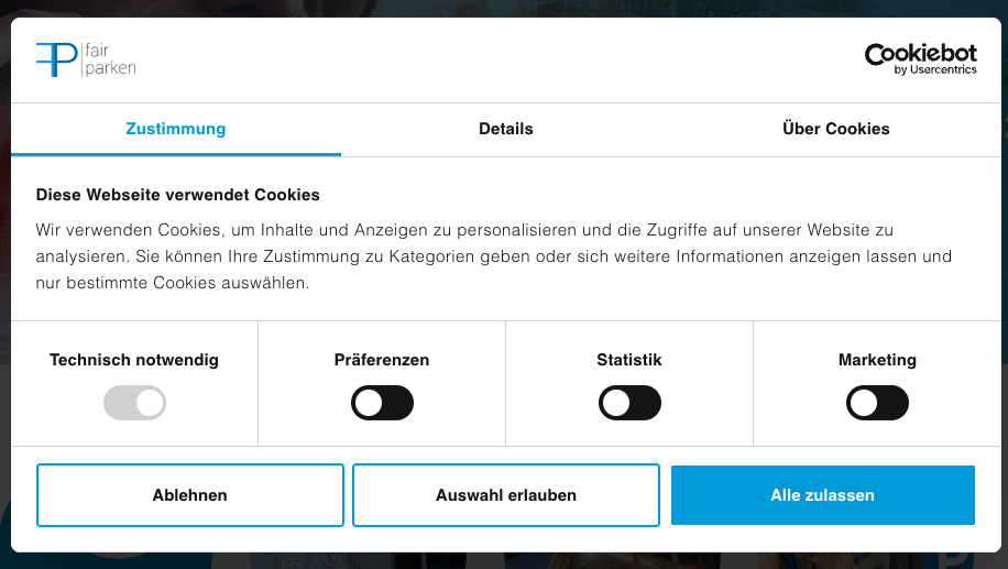 Doch damit noch nicht genug. Auf dem Karriereportal von Fair Parken, jobs.fairparken.com, wird ein anderes CMS und ein anderer Consent Dialog eingesetzt. Der Consent Dialog ist hier vorbidlich neutral gestaltet. Auch gibt es eine Möglichkeit, das Einverständnis zu widerrufen.