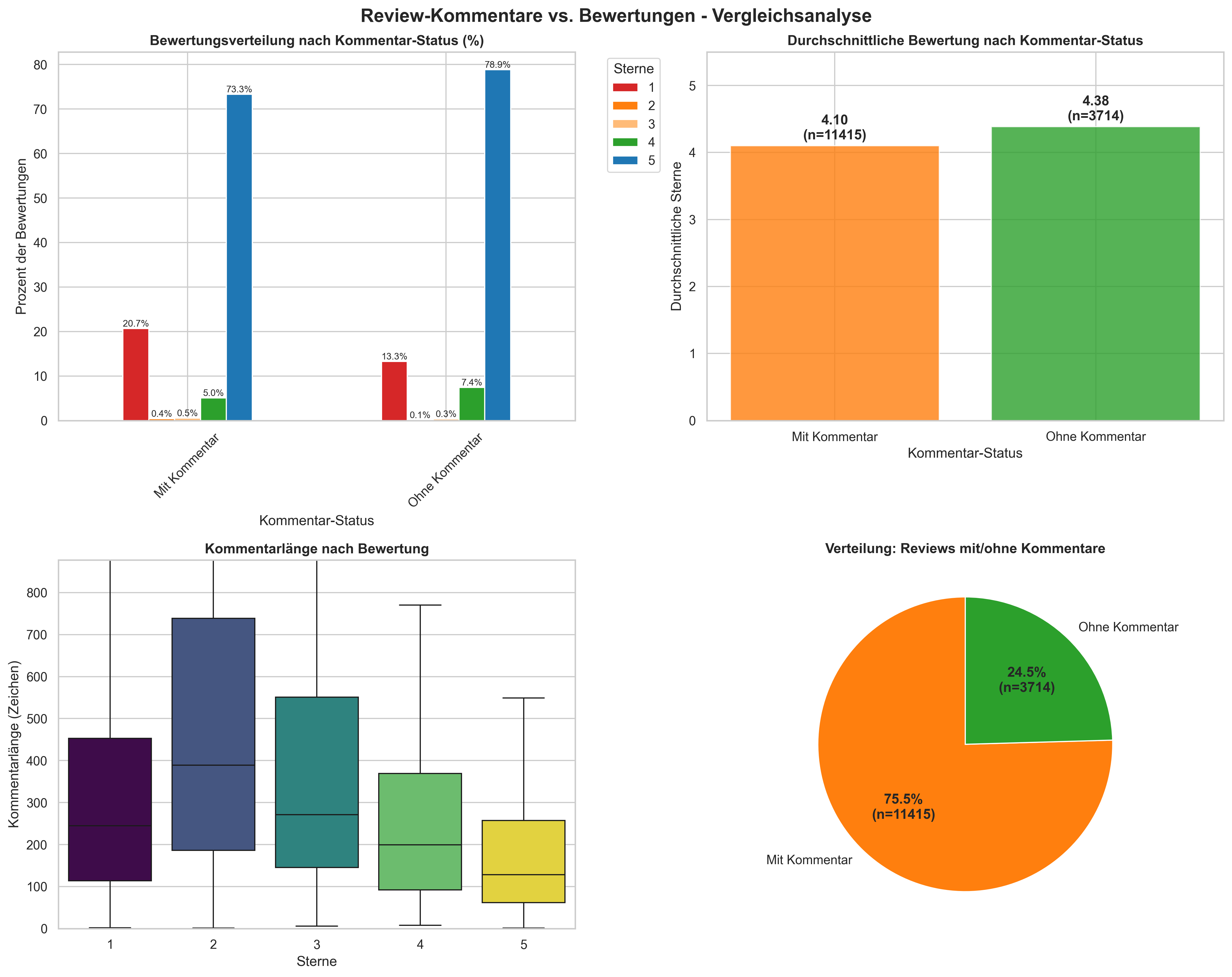 Egal ob mit oder ohne Kommentare - die Verteilung auf die Extreme - 1 Stern und 5 Sterne - ist auffällig. Man muss den Fleiß der RezsensentInnen anerkennen, 3/4 der Rezensionen enthalten einen Kommentar. Gleichwohl sind diese bei den 5-Sterne Bewertungen eher kurz.