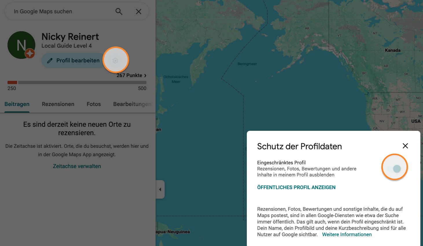 Hinweis Es ist interessant zu sehen, mit welchem Eifer die Menschen unter ihrem Klarnamen auf Google Maps Rezensionen abgeben und damit ein vollständiges Bewegungsprofil erzeugen. Jede Rezension eines Unternehmens enthält einen Verweis auf die “Profilseite” des Rezensenten. Von dort lassen sich alle Rezensionen abrufen, mit sekundengenauem Zeitstempel, einer exakten Geoposition (Longitude, Latitude) und natürlich dem Namen des Unternehmens und anderen Metadaten. kulinarische Vorlieben, Urlaubsorte oder Pendelstrecken sind so für jeden öffentlich einsehbar. Jeder Nutzer sollte seine Datenschutzeinstellung entsprechend anpassen!