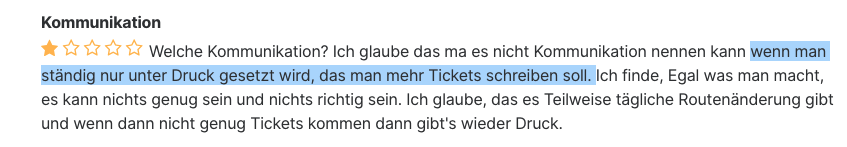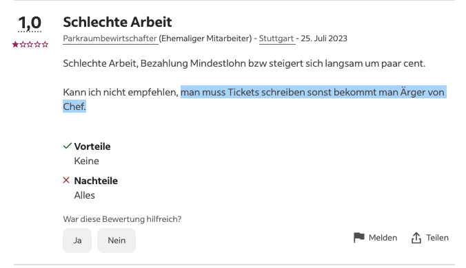 In diesem Zusammenhang lohnt ein Blick auf die Bewertungen ehemaliger ParkraumwächterInnen. Zwar handelt es sich hier nur um einen Auszug, trotzdem kratzen derartiuge Bemerkungen natürlich an der glänzenden Fassade: