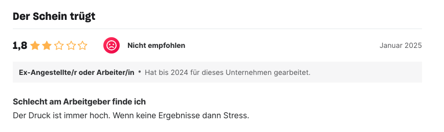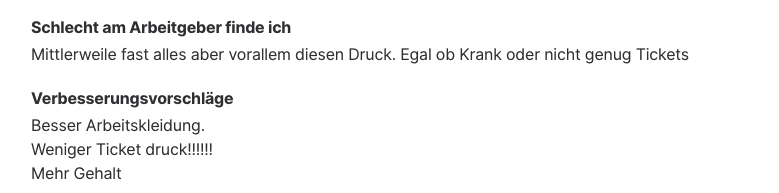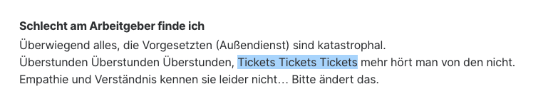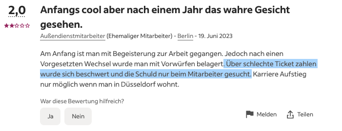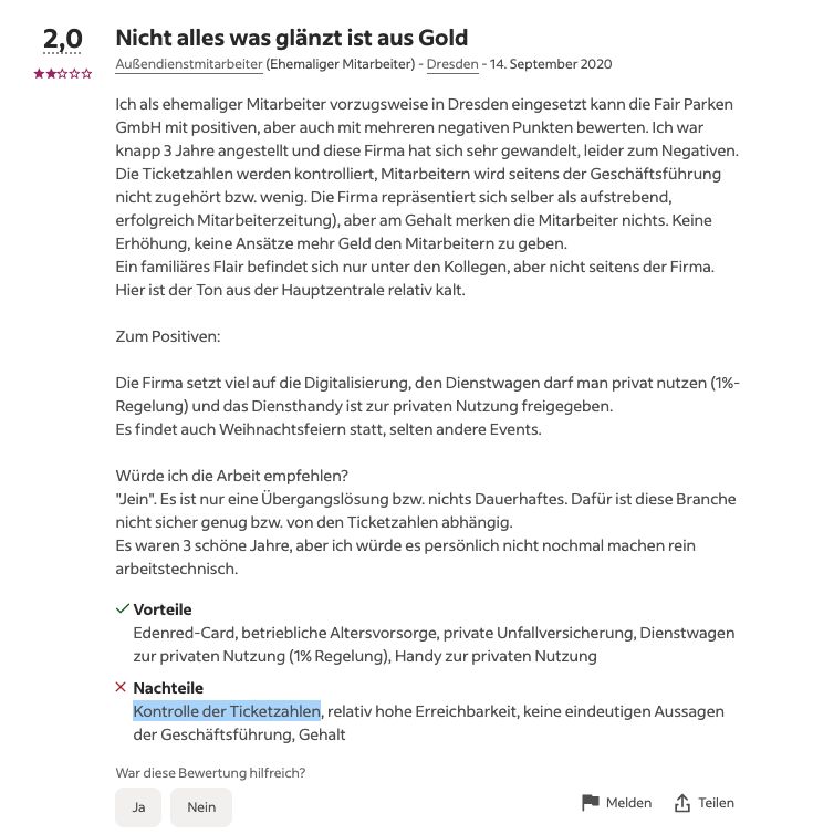 (Quelle: https://www.kununu.com/de/fairparken/kommentare?score=subpar,satisfactory und https://de.indeed.com/cmp/Fair-Parken-1/reviews?fcountry=ALL&sort=rating_asc)