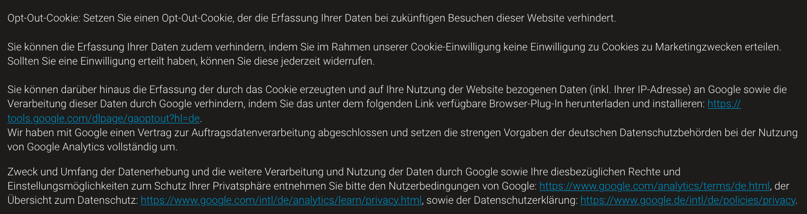 Die Anleitung zum Setzen eines Opt-Out-Cookies ist umständlich nur über ein Browserplugin möglich und der Link zum Datenschutz bei Google ist veraltet (https://www.google.com/intl/de/analytics/learn/privacy.html)