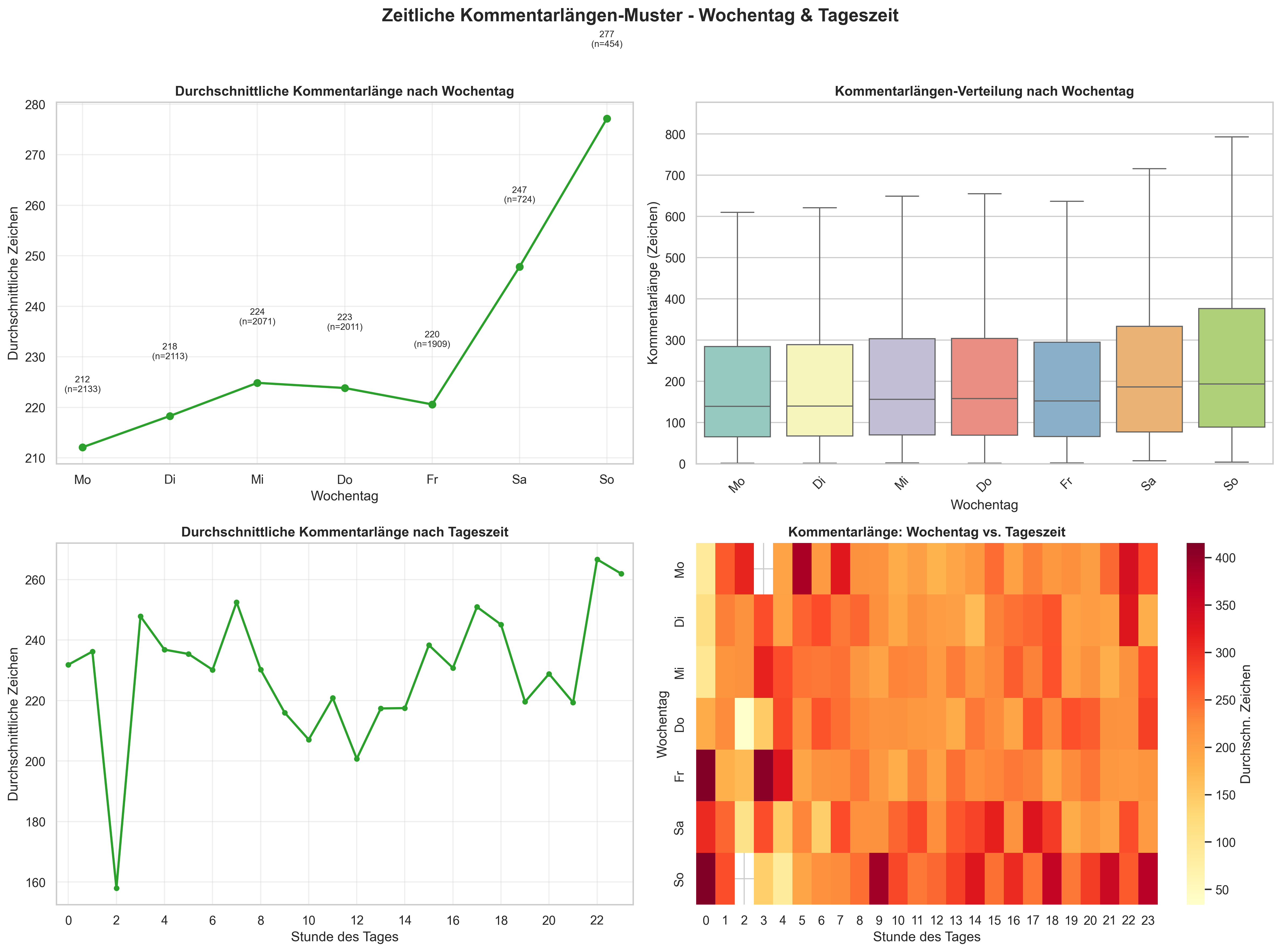 Zwar nimmt die Aktivität am Wochenende ab, gleichzeitig fühlen sich die Leute eher dazu bemüßigt, längere Bewertungen uzu schreiben.