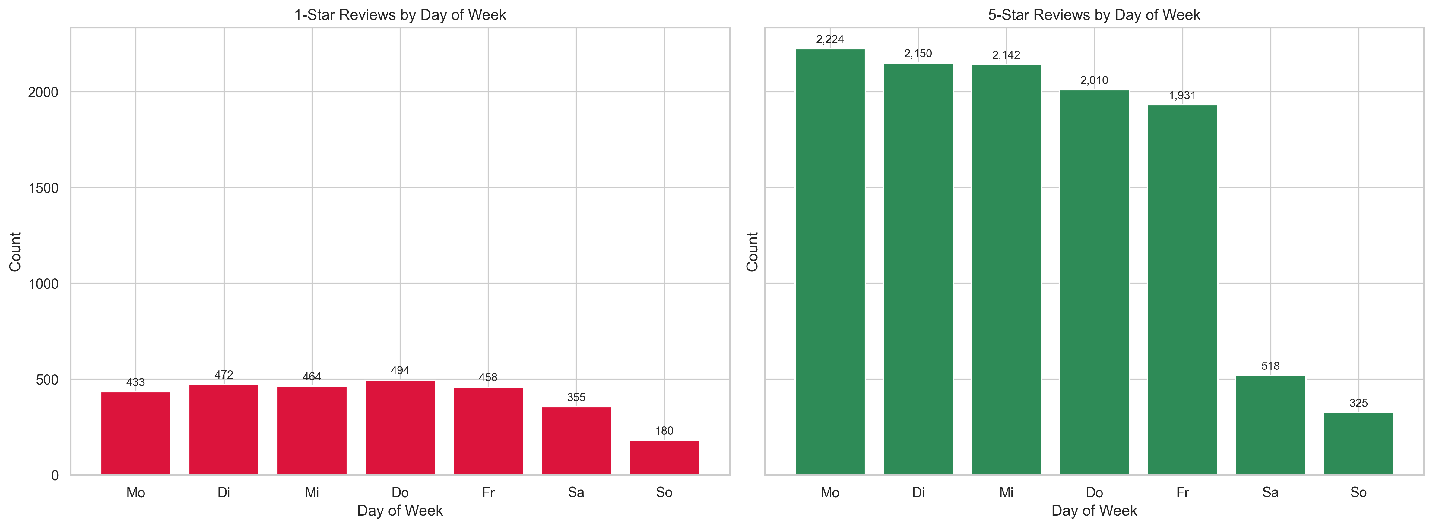 Aufällig ist hier nur, dass die 5-Sterne Bewertungen zum Wochenende stärker nachlassen als die 1-Stern Bewertungen. Was sagt das über die Motivation der RezensentInnen aus? Liegt das an der geringen Fallzahl?