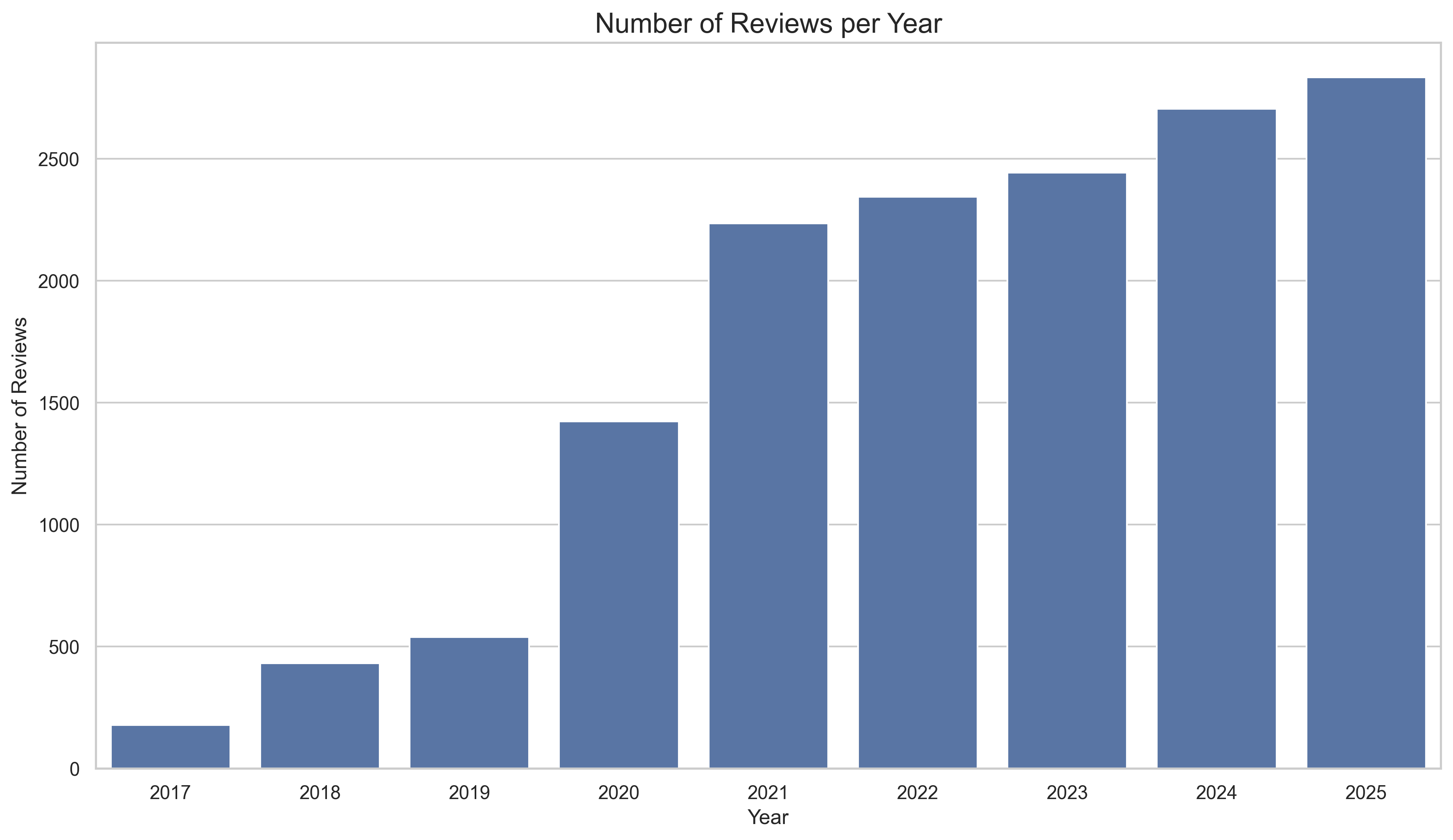 Die ersten Rezensionen gibt es im Jahr 2017. Ab da nimmt die Zahl stetig zu. In den Jahren 2020 und 2021 gibt es einen deutlichen Sprung.