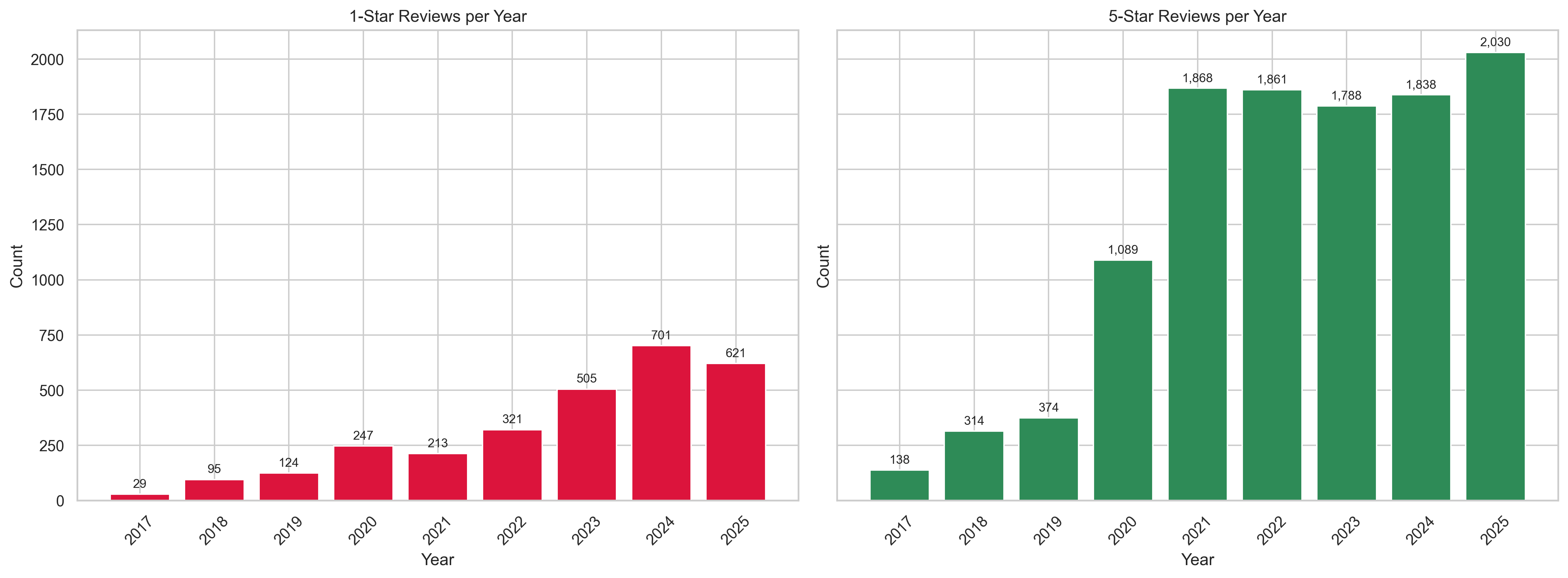 Und auch diese Grafik wirft Fragen auf. Zwar steigt auch hier die Anzahl der 1-Sterne-Bewertungen an in 2020 an, lässt in 2021 aber wieder nach. Nicht so die 5-Sterne Bewertungen, die in 2021 einen deutlichen Peak aufweisen. Gerade in den Jahren, in denen die Stimmung sehr aufgeheizt war, ist diese Entwicklung überraschend oder auf einen Fehler in den Daten zurückzuführen.