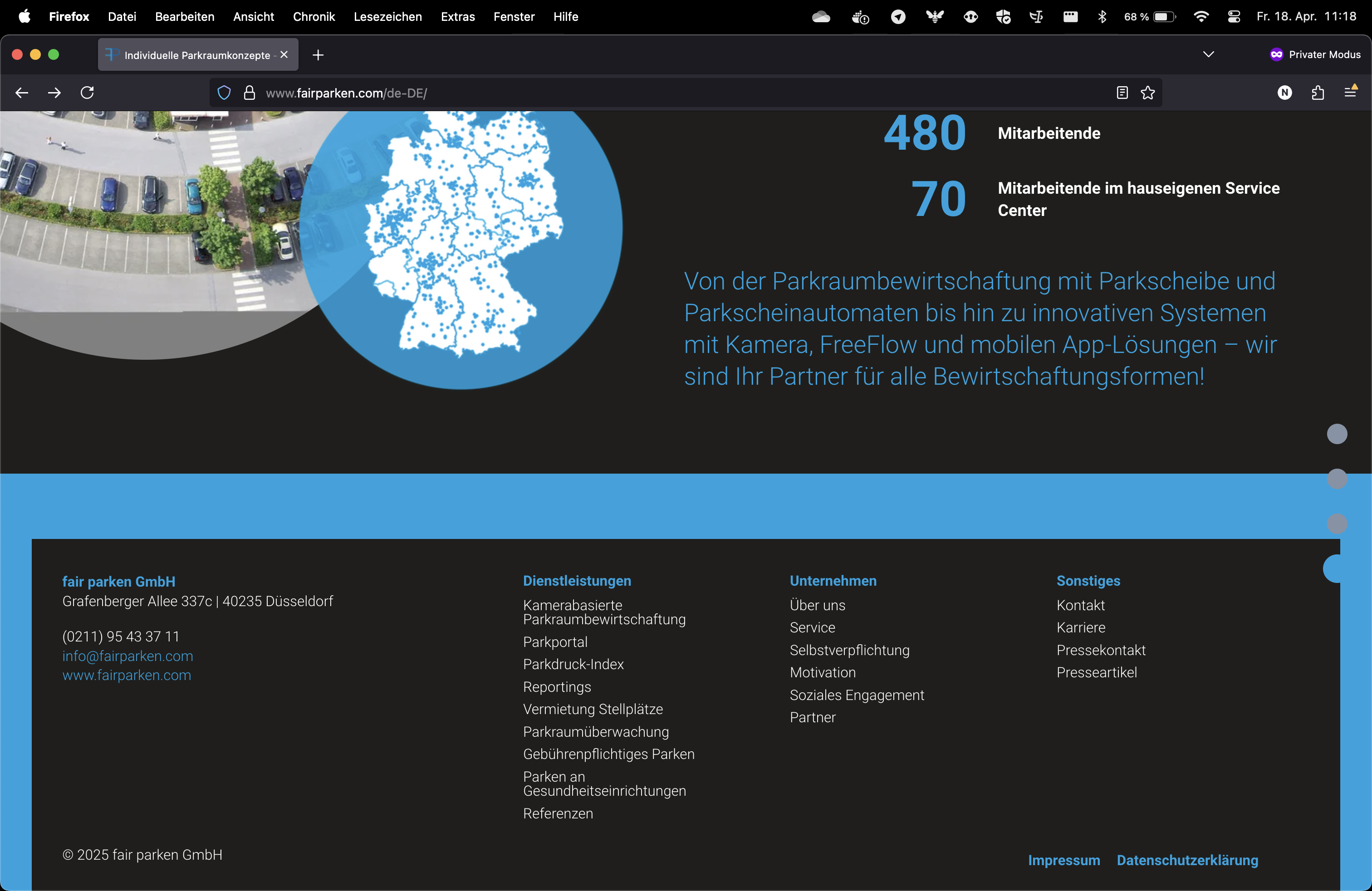 Update Hier hat Fair Parken ebenfalls nachgebessert. So wird nun z.B. der Einsatz von Rapidmail für den Newsletter-Service erwähnt. Allerdings wird auf der Karriere-Seite immer noch eine PDF-Datei verlinkt, die nicht barrierefrei ist.