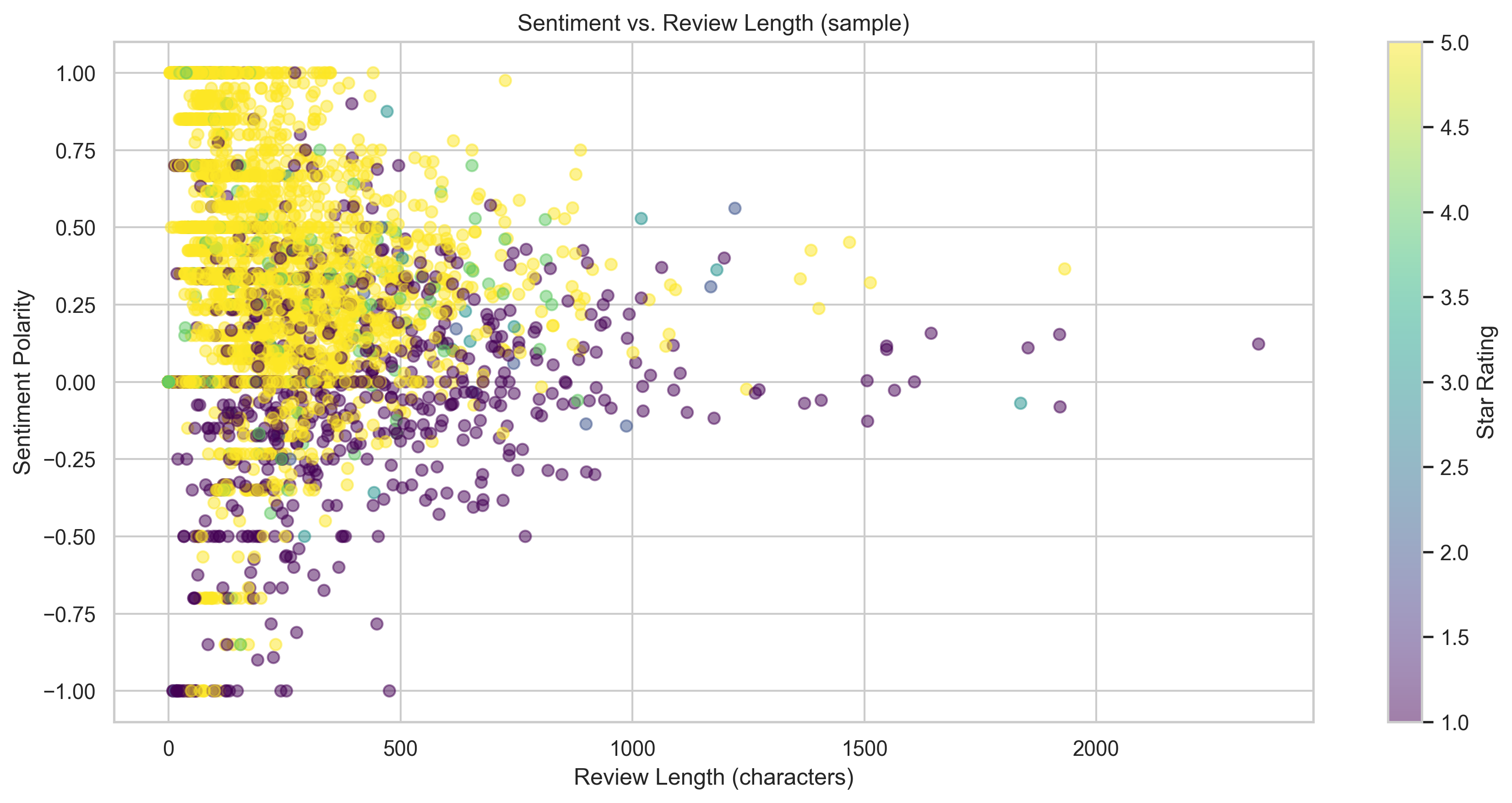 Die Sentiment-Analyse zeigt erwartungsgemäß, dass 1-Stern Bewertungen überwiegend negativ sind und 5-Sterne Bewertungen überwiegend positiv. Überraschung.