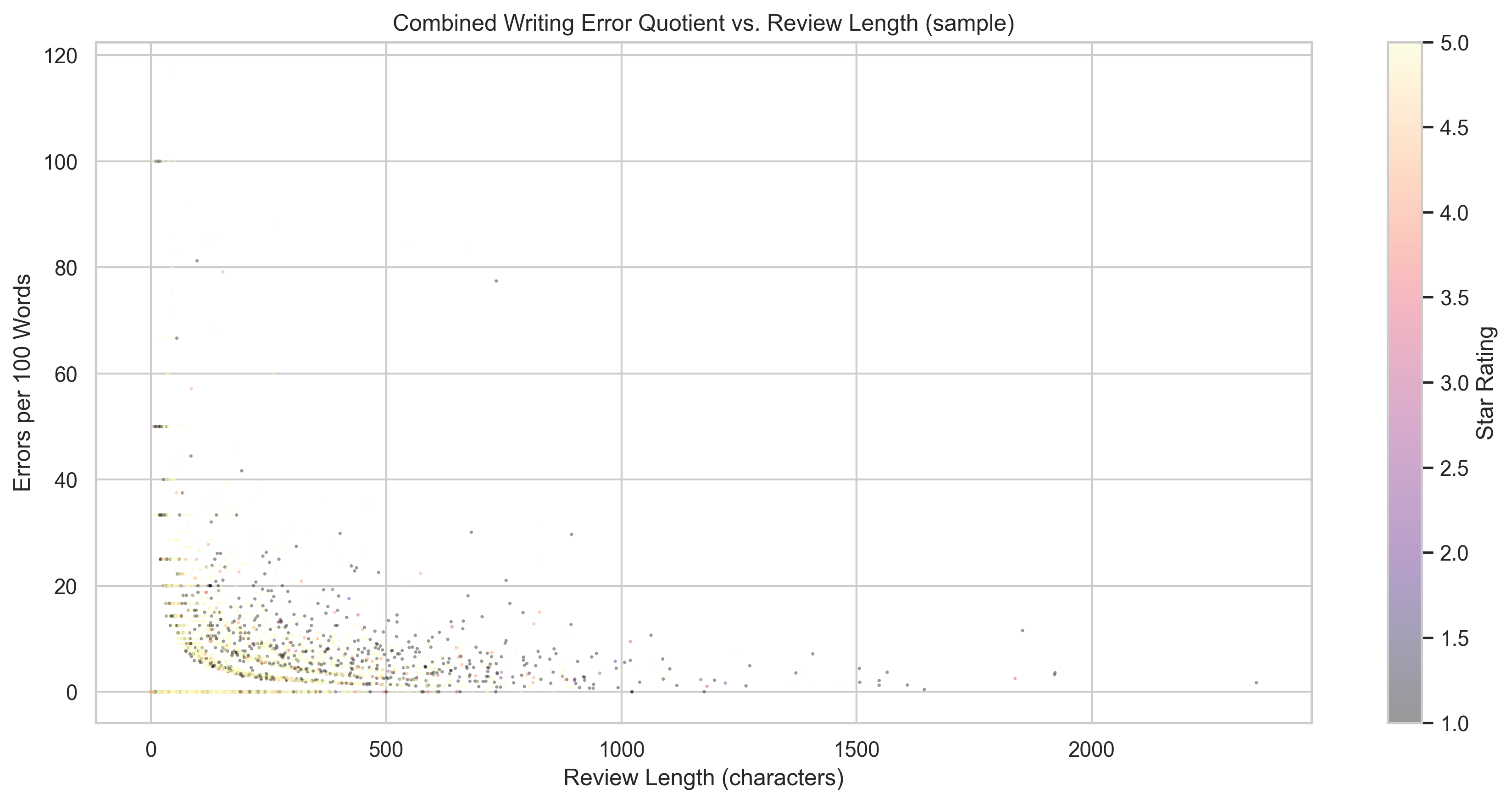 Bei der Grammatik, Rechtschreibung und der kombinierten Betrachtung aus beidem zeigt sich etwas, das man vielleicht erwarten kann. Negative Bewertungen sind eher fehlerhaft. Die Abweichungen bei 2 - 4-Sterne Bewertungen darf man getrost ignorieren in Anbetracht der geringen Fallzahlen.
