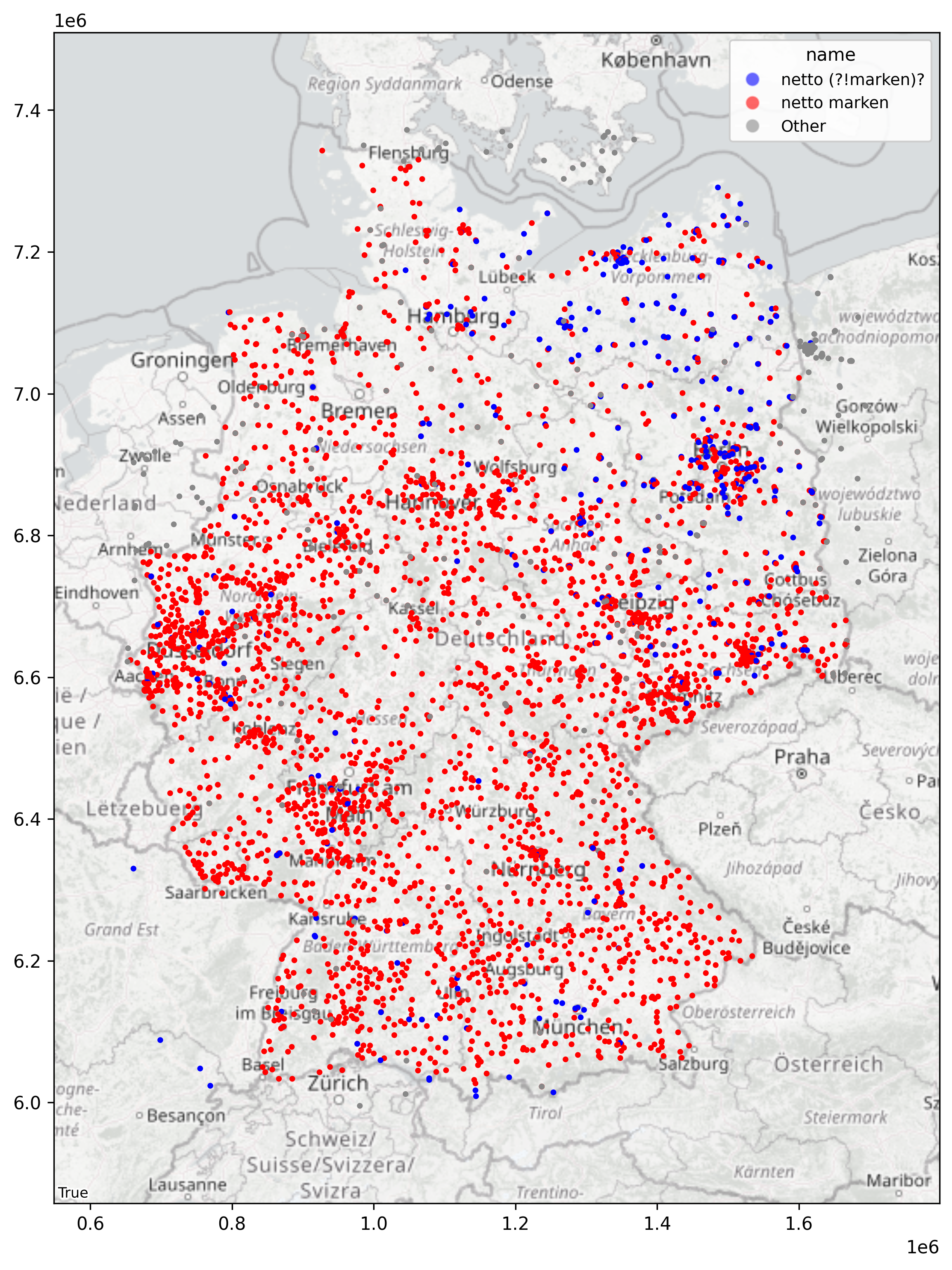 Genug gelunzt! Ich würde sagen, wir haben alles gesehen, oder? Viel mehr gibt der Datensatz leider nicht her. Am spannensten ist aus meiner Sicht noch die Verteilung der Fialien über das Land. Wenig überraschend konzentrieren sich die Supermärkte in den Großstädten. Berlin, Hamburg, Dresden, München und so weiter. Im Osten Deutschlands gibt es sehr viele weiße Flecken - vor allem in Mecklenburg Vorpommern - wohingegen ein dichtes Band vom Rührgebiet über den Rhein-Neckar-Kreis bis nach Süd-Ost-Deutschland zieht.