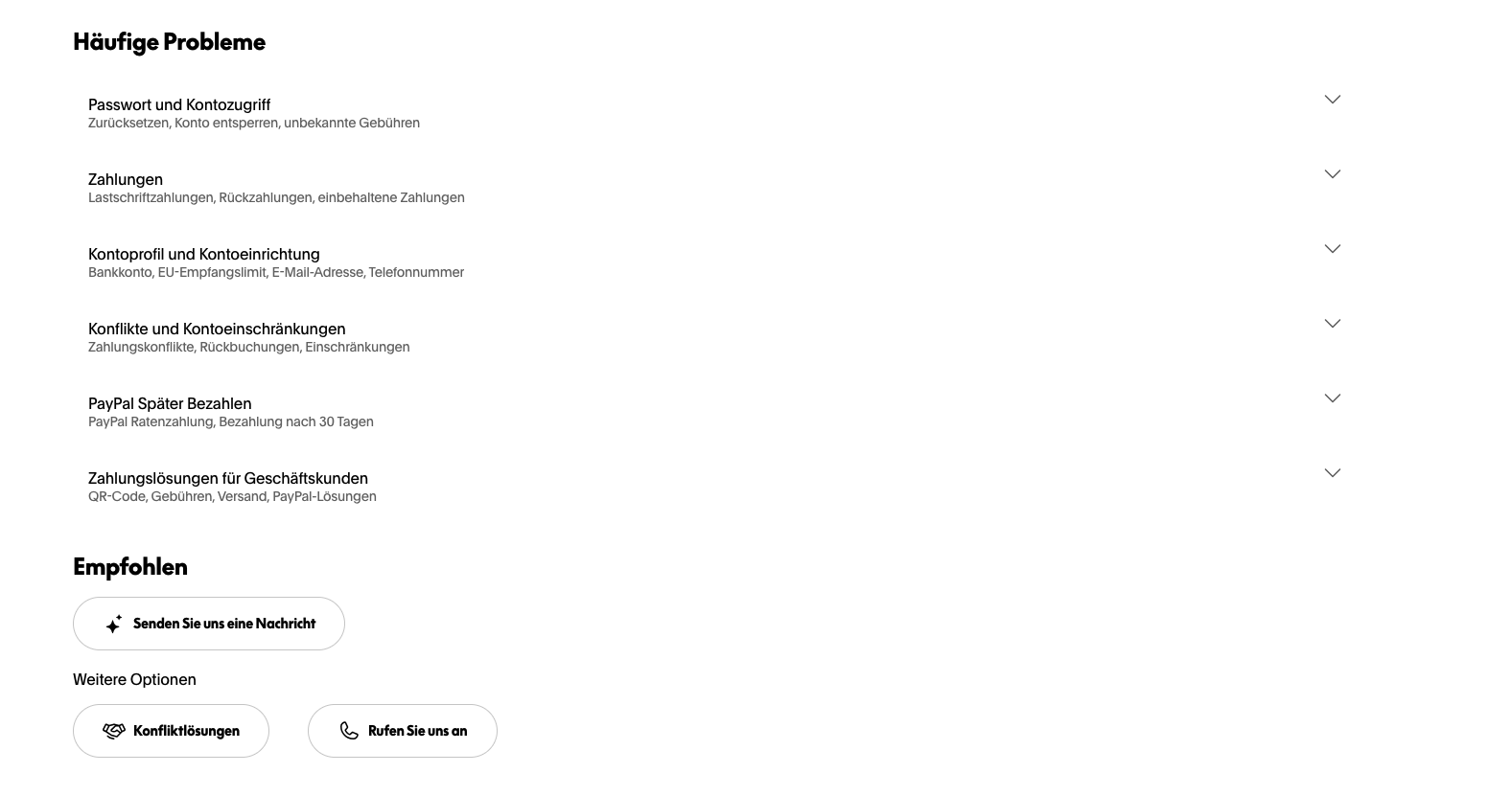 An den Kundenservice wenden? Da waren wir schon. Der Link führt zurück zu https://www.paypal.com/de/cshelp/contact-us – der Kundenservice ist entweder ein KI-Chatbot oder nur über Telefon erreichbar.