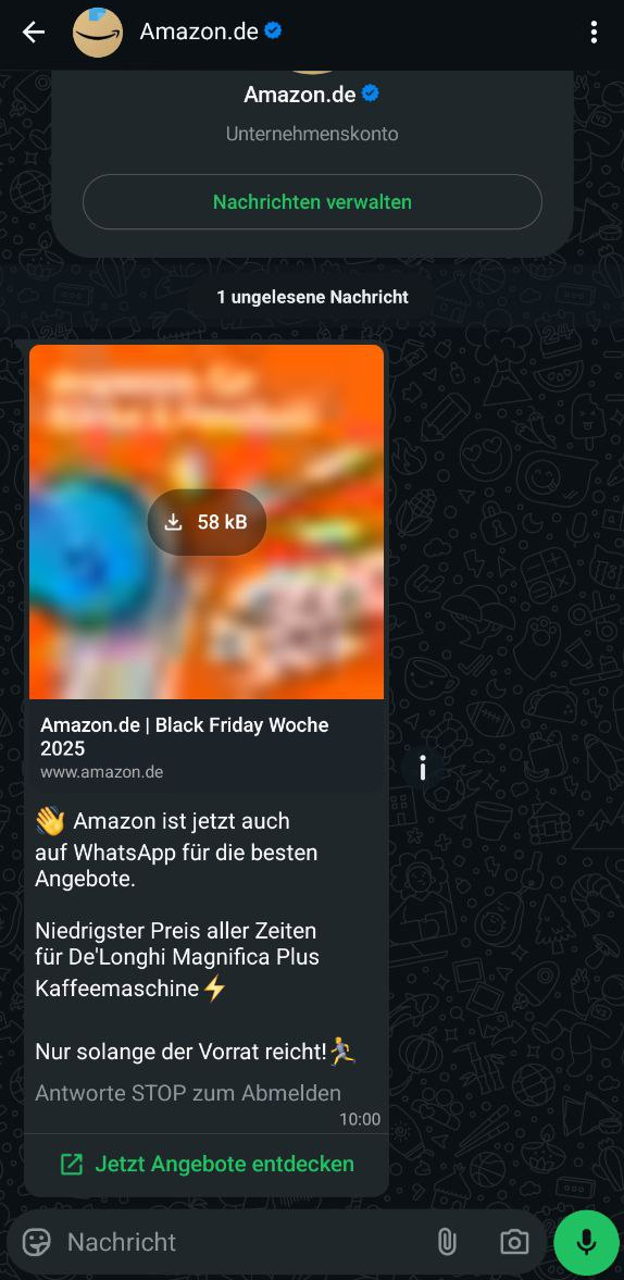 Ja, herzlich willkommen, Amazon! WhatsApp gibt’s seit 2009 - schön, dass ihr es jetzt auch geschafft habt. Ich habe den Quatsch natürlich erstmal als Spam gemeldet.