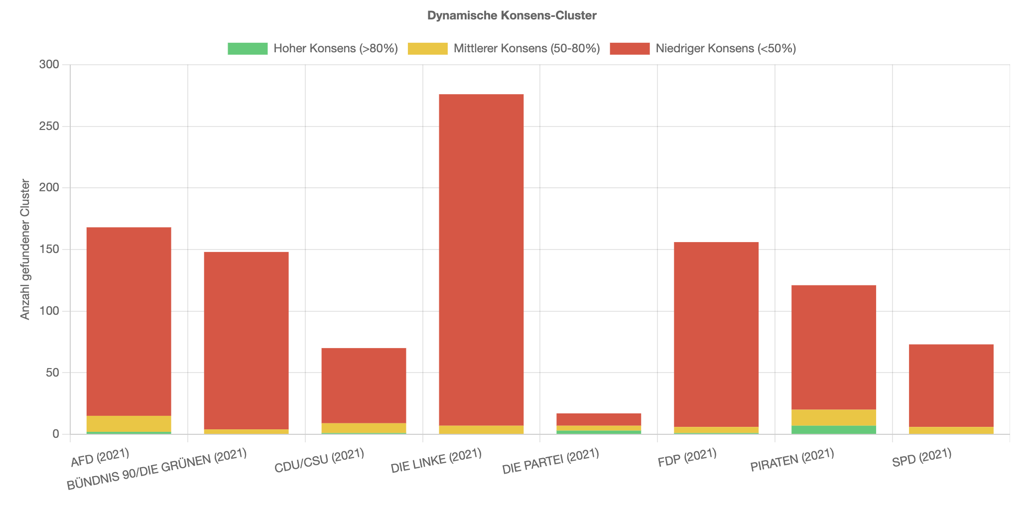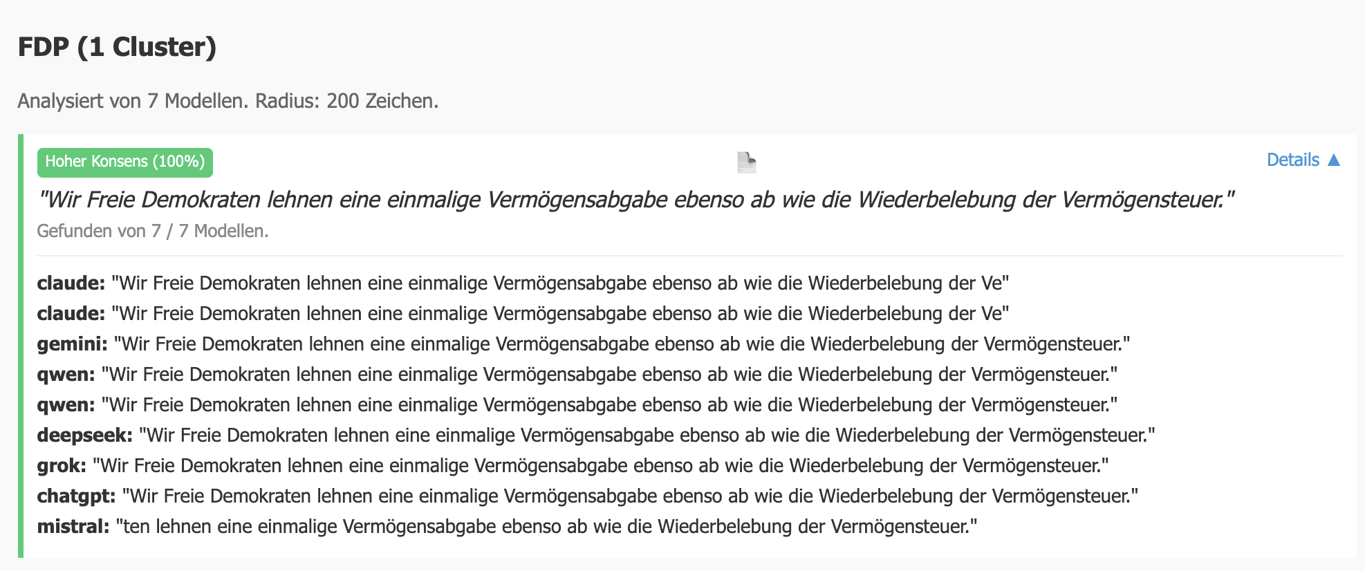 Sinnloserweise zeigt die erste Ansicht “nur” die Ergebnisse eines Modells für ein ausgewähltes Jahr und eine Partei an. Als Einstieg und zum Schmökern. Da die Ergebnisse aber alles andere als eindeutig sind, schauen wir gleich mal im Bereich “Konsens” vorbei.