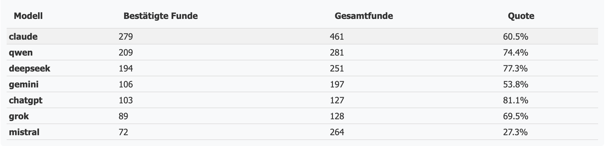 Claude hat zwar mit 60% eine relativ gute Konsensrate, will aber insgesamt auch über 460 Verbote erkannt haben. Aus dem Grund macht es vielleicht Sinn, diese beiden Modelle in der Betrachtung außen vor zu lassen.