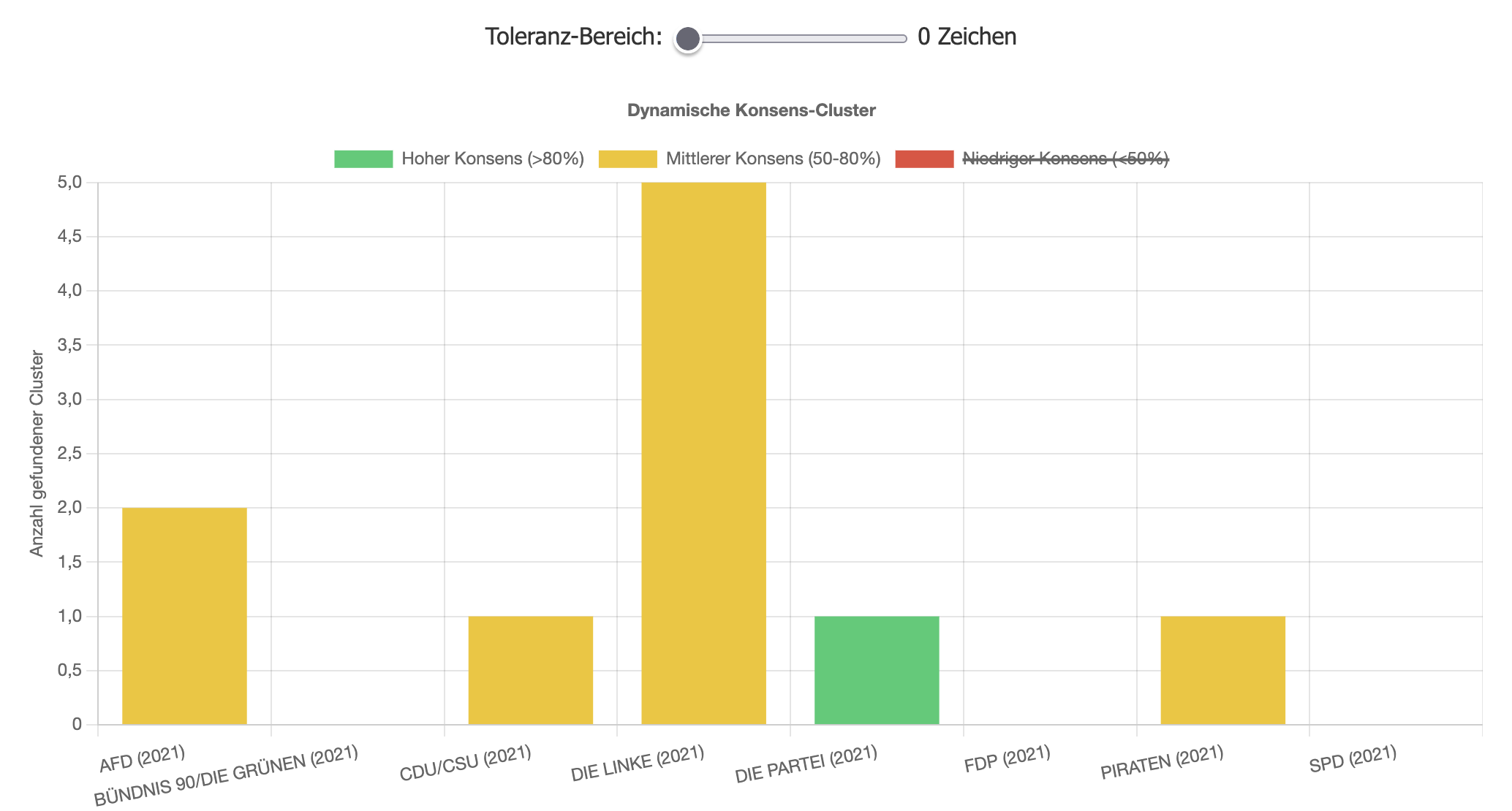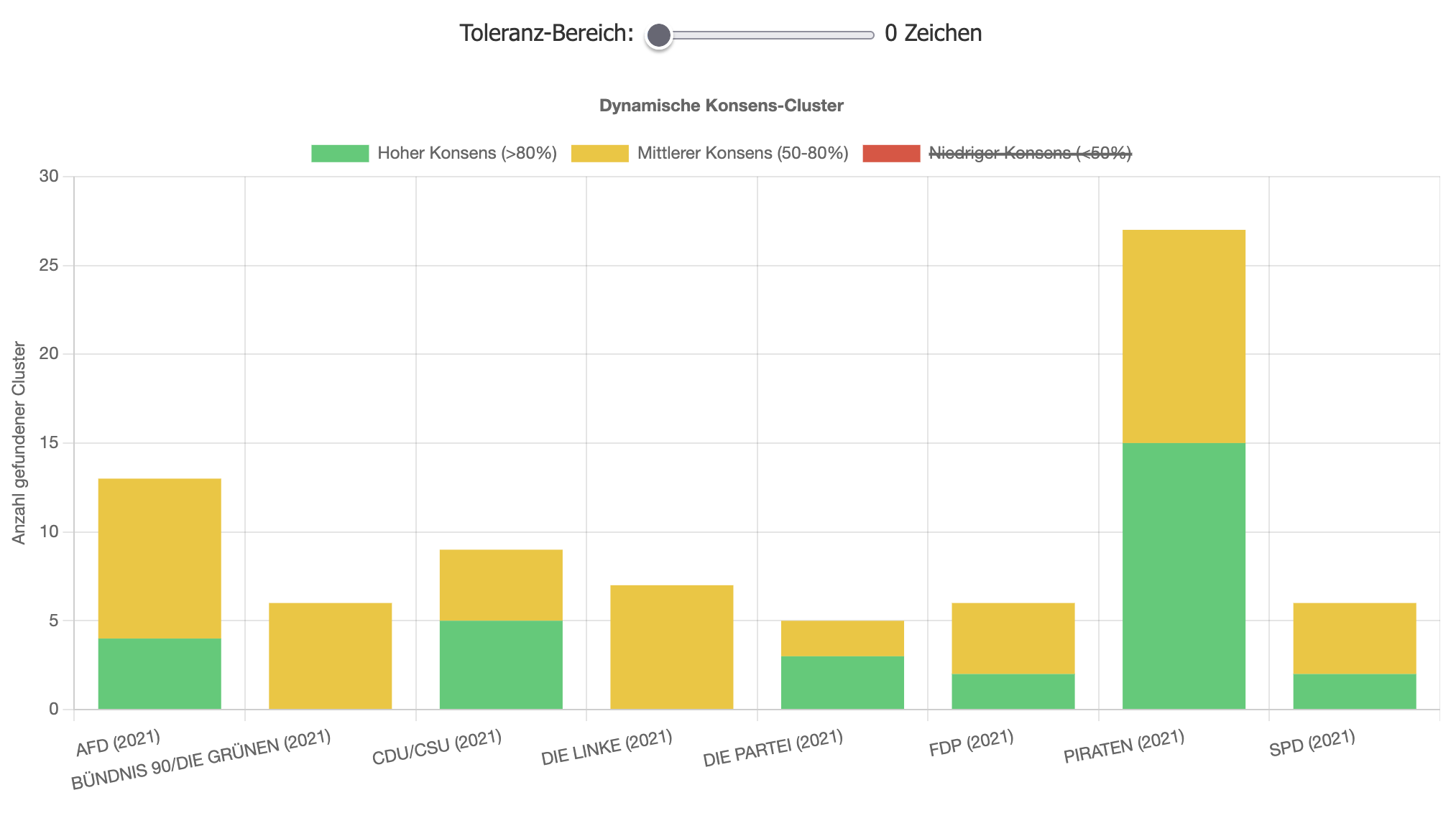 Nun ist es aber so – und soviel zum Thema Vorsicht: Diese Aussage basiert auf der Summe aller Verbote. Die Ergebnismenge lässt sich über den Toleranzbereich noch etwas verfeinern. Wir fassen Verbote zusammen, die nahe zueinander liegen, um doppelte Zählungen zu vermeiden. In der Regel sollte das nicht vorkommen, da die Modelle recht zuverlässig die Textzitate liefern, anhand dessen wir die Position bestimmen, am Beispiel der FDP: