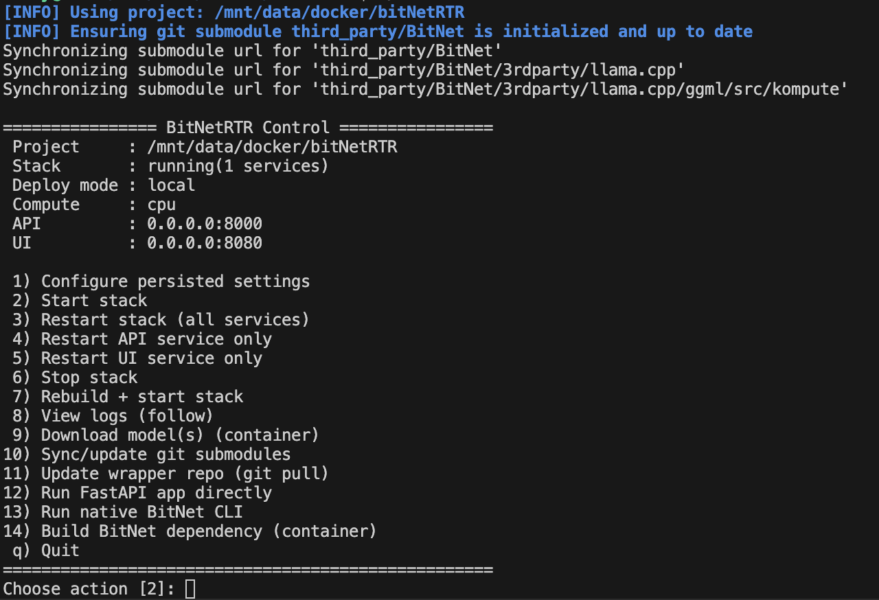 Zunächst mal ziehst du dir das Repo auf deinen Computer, inklusive der Abhängigkeit (nämlich dem BitNet-Framework von Microsoft). Du erhälst dazu einen Docker-Container, in dem der ganze Spaß installiert wird - dein System bleibt sauber. Von draußen kannst du das ganze System steuern: