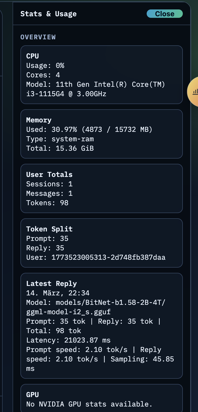 Und dann gibt es noch einen kleinen Statistik-Bereich auf der rechten Seite. Wie du siehst, habe ich nicht zu viel versprochen: Auf der Kiste läuft eine alte 11th Gen Intel CPU - die für einen kleinen Chat aber trotzdem noch zu haben ist:
