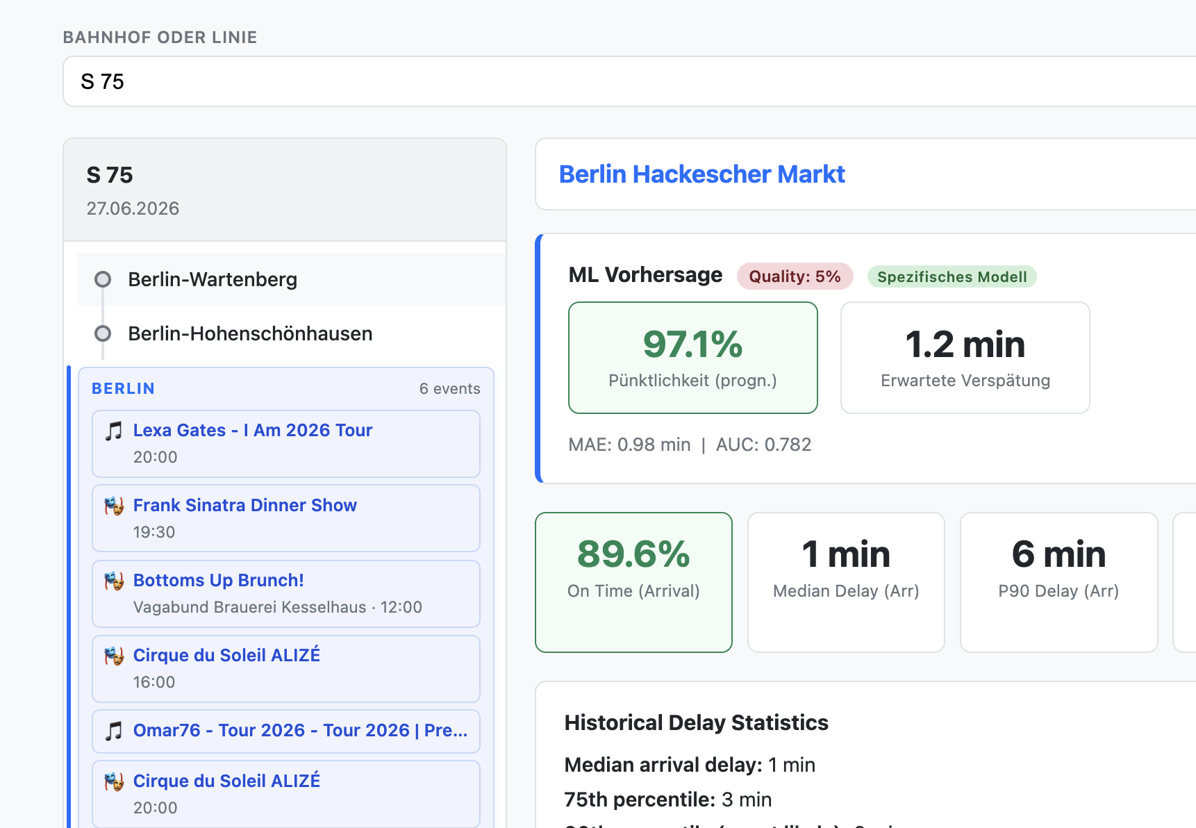 Das Ganze nutzt nicht nur die historischen Ankunftszeiten, sondern auch Wetterdaten, Preise für Kraftstoffe, Tageszeit und Wochentag sowie die Ferienzeiten. Und als Bonus wird dir angezeigt, ob in der jeweiligen Stadt gerade ein größeres Event stattfindet: