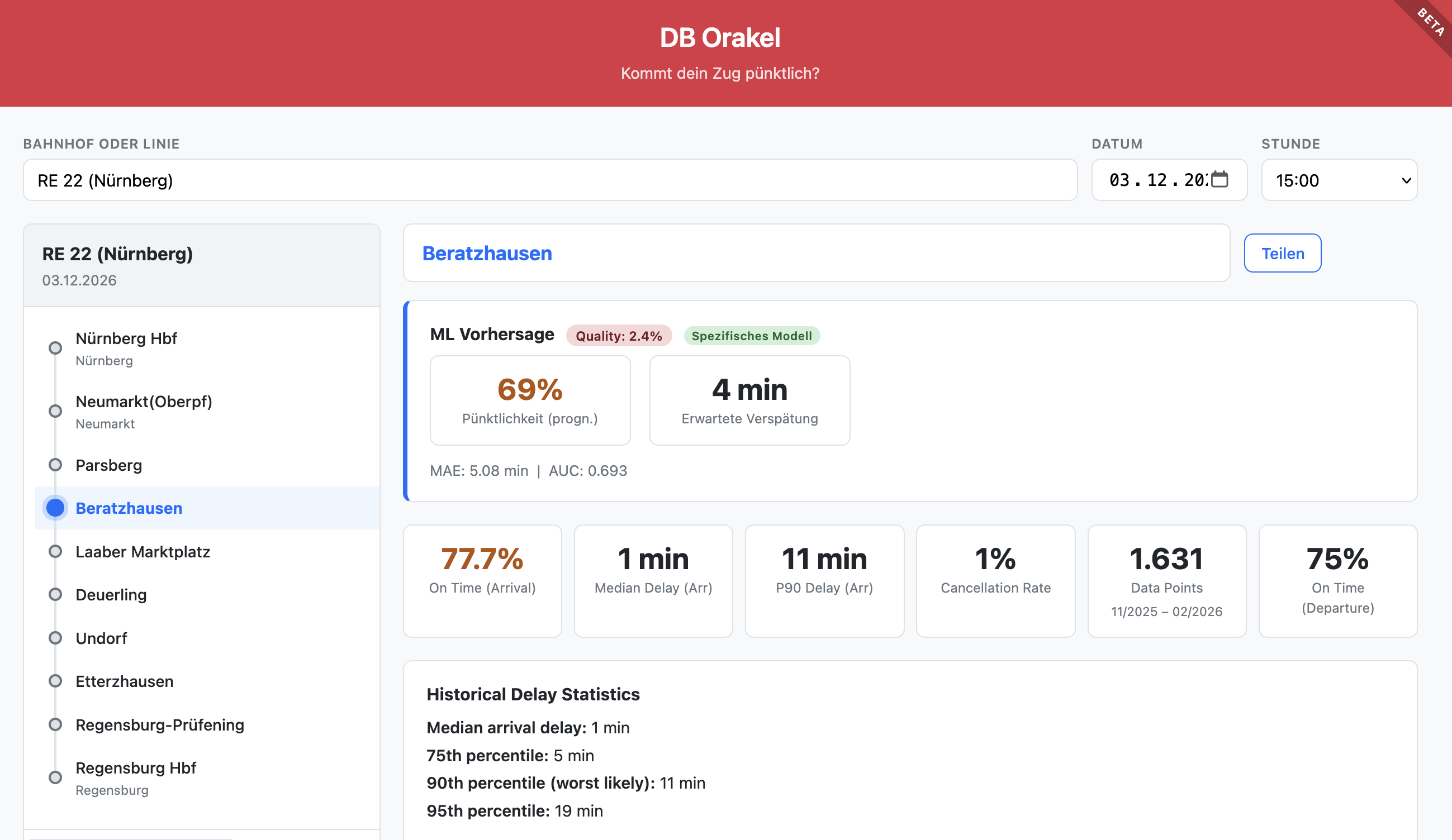 Im Prinzip ist die Seite schnell erklärt: Du suchst dir einen Bahnhof heraus und einen Zug, der an diesem Bahnhof zu einem bestimmten Datum anhält und erhältst eine Wahrscheinlichkeit, wie pünktlich der Zug wohl sein wird.