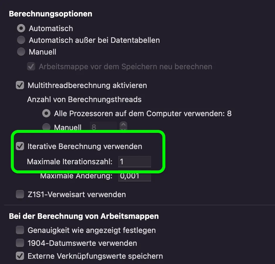 First let me introduce you into an widely ignored feature in Excel: Iterative calculations. Excel tries to protect you from “circular references” and therefore disables this feature by default.